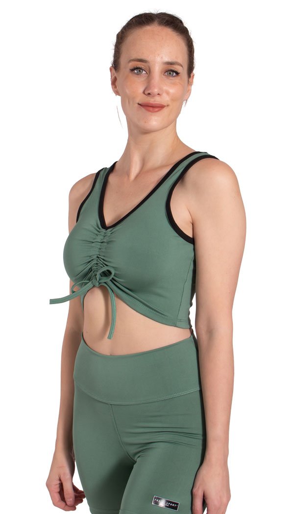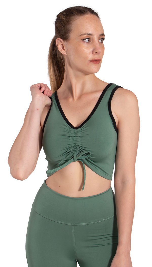 ¡Nuevo diseño de top deportivo confeccionado con lycra sport premium! Este modelo posee como principal característica un detalle de frunce en el frente que, gracias a sus tiras de ajuste, te permite regular el largo del top a tu comodidad. Su diseño está pensado para que, al ajustarlo, el escote y la parte inferior del top adquieran una forma de “v” redondeada que ayude a resaltar el busto y la cintura. Su bretel intermedio y su estructura envolvente le confieren una capacidad de sujeción adecuada para realizar actividades de impacto medio y bajo. ¡Combinalo con nuestra biker Juni!